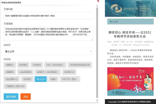 在醫(yī)院內(nèi)容管理系統(tǒng)基礎(chǔ)上開發(fā)一套接入企業(yè)微信的系統(tǒng)。能夠?qū)?nèi)容管理系統(tǒng)中的文章推送到企業(yè)微信指定的應(yīng)用號中??蛇x不同應(yīng)用,不同用戶標(biāo)簽做到信息資源的定向推送。擁有審核機(jī)制,普通用戶申請推送,管理員審核通過后發(fā)起企業(yè)微信消息推送。極大改善了普通信息資源發(fā)布后用戶被動閱讀的弊端。