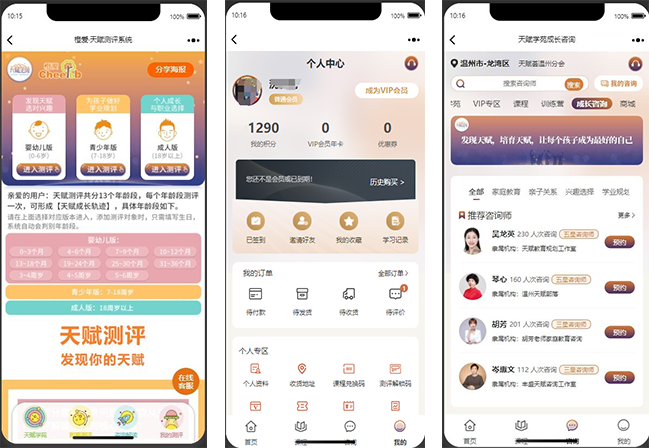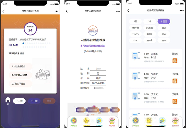 橙愛測(cè)評(píng)系統(tǒng)用到的八大智能數(shù)據(jù)、測(cè)評(píng)試卷、測(cè)評(píng)題目、測(cè)評(píng)結(jié)果數(shù)據(jù)、測(cè)評(píng)報(bào)告數(shù)據(jù)、測(cè)評(píng)報(bào)告訂單、訪問日志、報(bào)告解鎖碼和預(yù)約用戶等內(nèi)容進(jìn)行管理。系統(tǒng)支持多用戶多年齡段的測(cè)評(píng),根據(jù)用戶端測(cè)試結(jié)果進(jìn)行數(shù)據(jù)處理,從而形成測(cè)評(píng)對(duì)象的專業(yè)測(cè)評(píng)報(bào)告,傳輸給前端用戶查閱。